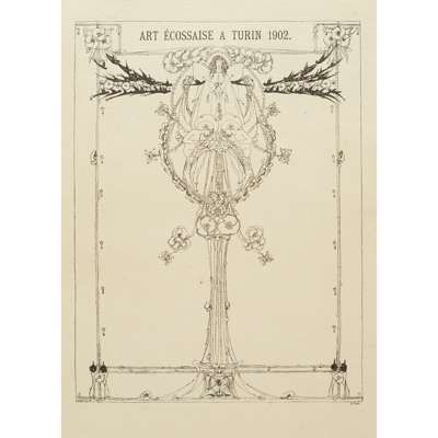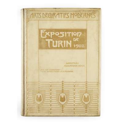 L'Exposition Internationale des Arts Décoratifs Modernes A Turin 1902. Darmstadt, 1902. 4to, 4 plates, 3 in colour, original vellum gilt, small blue tick to p.27, a few pages a little edge-worn, occasional light soiling, some soiling and rubbing to covers, gilt on spine rubbed