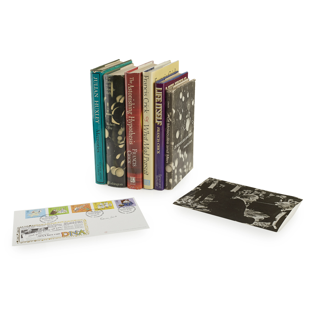 First Day Cover Stamps "Secret of Life" 2003, stamped "Cavendish Laboratory, Cambridge", the envelope signed by Francis Crick; Huxley, Julian Memories. G. Allen & Unwin, 1970, first edition, signed "Francis Crick" on half-title, dust-jacket; Official Press Photo of Crick and Watson receiving Nobel Prize in 1962; Crick, Francis What Mad Pursuit. New York, Basic Books, 1988. First edition, dust-jacket; Of Molecules and Men. University of Washington Press, 1966. First edition, dust-jacket slightly worn, price clipped, owner's name tippexed out on endpaper; Crick, F. Life Itself, its origin and nature. New York: Simon & Schuster, 1981, First edition, dust-jacket; Crick, F. The Astonishing Hypothesis. Simon & Schuster, 1994, First edition, dust-jacket; Olby, R. The Path to the Double Helix. University of Washington Press, 1974, dust-jacket (8)