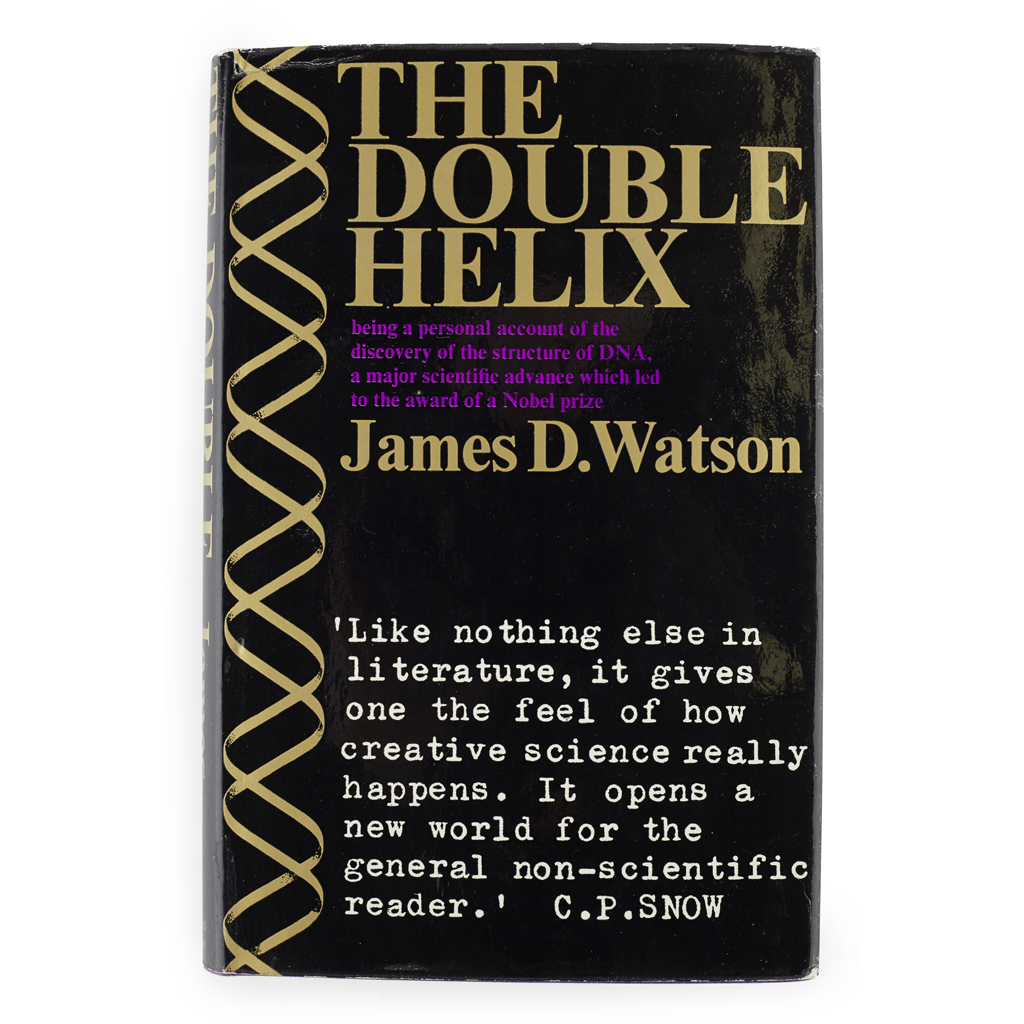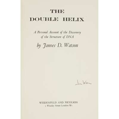 The Double Helix. London: Weidenfeld and Nicolson, 1968. First edition, signed by Watson to title page (unusually signed "Jim Watson"), original purple cloth, dust-jacket neatly strengthened on verso at head of spine