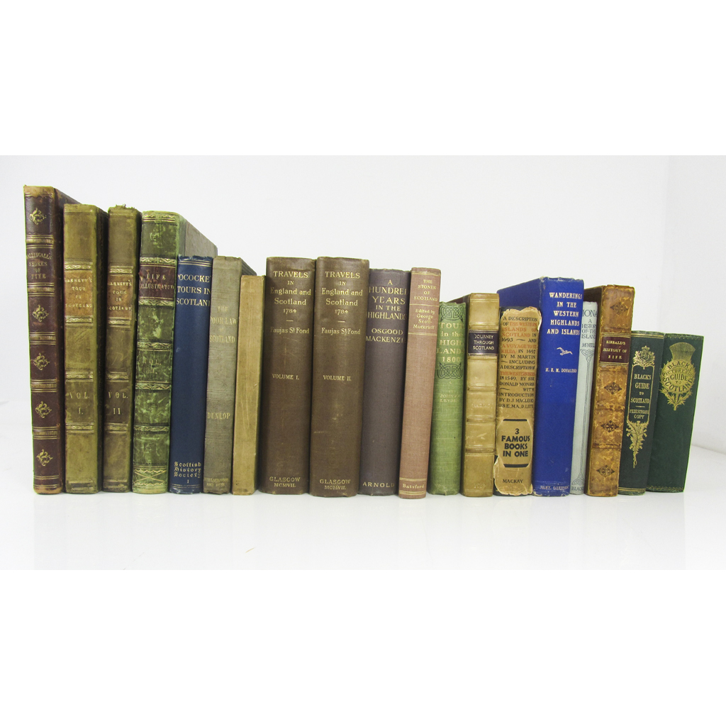 Observations on a Tour through the Highlands and part of the Western Isles of Scotland. London: John Stockdale, 1811. 2 volumes, 4to, contemporary calf rebacked, several plates laid-down; Ballincall, William The Shores of Fife. Edinburgh: Edmonston and Douglas, 1872. 4to, contemporary red morocco gilt; Leighton, John M. - Joseph Swan & James Stewart History of the County of Fife. Glasgow: Joseph Swan, 1840. 4to, volume iii only, contemporary green half calf; Sibbald, Robert The History, Ancient and Modern, of the Sheriffdoms of Fife and Kinross. Cupar: R. Tullis, 1803. 'New Edition', 8vo, contemporary calf; Macky, John A Journey through Scotland. London: J. Pemberton, 1723. 8vo, modern quarter calf; Dunlop, Alexander Murray The Law of Scotland regarding the Poor. Edinburgh: William Blackwood and Sons, 1854. 'New Edition', 8vo, original cloth; Lumsden & Son Steam-Boat Companion; or Stranger's Guide to the Western Isles & Highlands of Scotland. Glasgow: James Lumsden & Son, 1839. Tall 8vo, original cloth gilt; and 11 others, sold not subject to return (19)