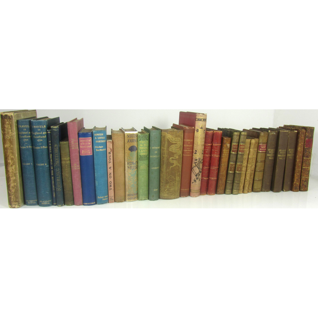 A Tour in Sutherlandshire. London: John Murray, 1849. 2 volumes, 8vo, contemporary red half-morocco gilt; Wilson, James A Voyage round the Coasts of Scotland and the Isles. Edinburgh: Adam and Charles Black, 1842. 8vo, original cloth gilt rebacked, bookplate of J.A. Harvie-Brown; [Macky, John] A Journey through Scotland. London: J. Pemberton, 1732. Second edition, 8vo, contemporary calf rebacked; Grant, J.P. Memoir and Correspondence of Mrs. Grant of Laggan. London: Longman, Brown, Green, and Longmans, 1844. 3 volumes, 8vo, original cloth, bookplates; McNayr, James A Guide from Glasgow... Glasgow, 1797. 8vo, contemporary half calf, joints split; Murray A Companion and Useful Guide to the Beauties of Scotland, to the Lakes of Westmoreland, Cumberland, and Lancashire. London: George Nicol, 1799. 8vo, contemporary quarter calf with vellum corners; An Account of the Principal Pleasure Tours in Scotland... Edinburgh: John Thomson & Co., 1821. 8vo, contemporary half-calf rebacked; Trench, Francis Scotland, its Faith and its Features... London: Richard Bentley, 1846. 2 volumes, 8vo, contemporary green half-calf gilt; Letters from the Mountains... London: Longman, Hurst, Rees & Orme, 1807. 3 volumes, 12mo, contemporary half-calf; and 15 later works (30)