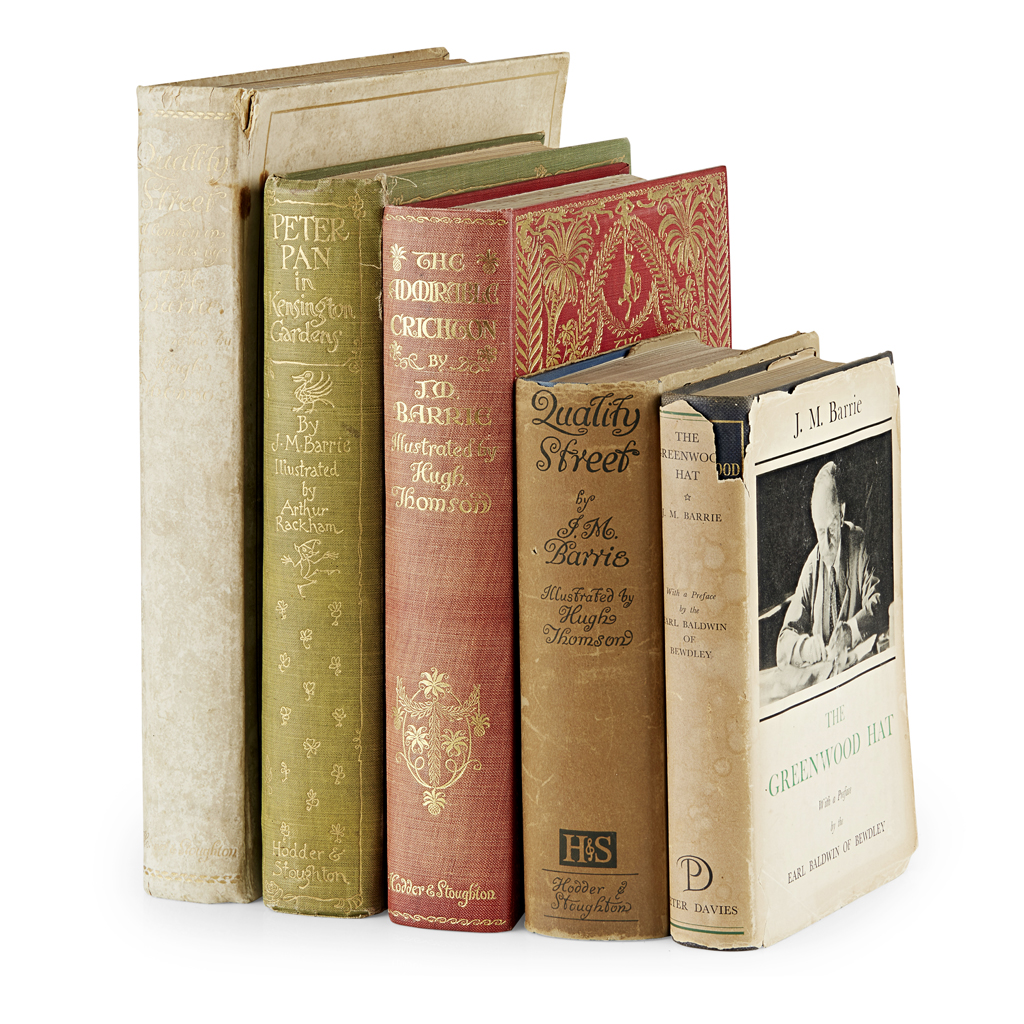 Peter Pan in Kensington Gardens. London: Hodder & Stoughton, [1912]. 4to, illustrations by Arthur Rackham, original green cloth gilt; [Idem] The Admirable Crichton. London: Hodder & Stoughton, [1914]. 4to, illustrations by Hugh Thomson, original red cloth gilt; [Idem] Quality Street. [London:] Hodder & Stoughton, 1901. 4to, illustrations by Hugh Thomson, original vellum, some soiling, bowing and wear, bookplate; [Idem] Quality Street. [London:] Hodder & Stoughton, 1901. 8vo, illustrations by Hugh Thomson, original blue cloth gilt, dust-jacket; [Idem] The Greenwood Hat. London: Peter Davies Limited, 1937. 8vo, original cloth, dust-jacket worn (5)