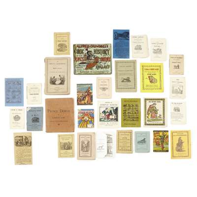The Galloping Guide to the ABC. 16pp., excluding blue pictorial wrappers, old collector's number on slip on wrapper; The Cries of Banbury and London; Jack the Giant Killer; The Book of Beasts for Young Persons; Old Mother Hubbard and Her Dog; Nursery Poems; London Jingles and Country Tales; Jack & Jill and Old Dame Gill; The History of Tom Thumb, all 16pp. including wrapper; Alnwick: W. Davison, printer A Natural History of Foreign Quadrupeds, 36pp., original pictorial green wrappers; Otley: W. Walker, printer The Pretty and Entertaining History of Tom Thumb. 16pp including wrappers; London: Dean & Munday, printer The Adventures of Jack the Giant Killer, 16pp. including printed yellow wrappers; London: Whitrow & Co., publisher The Honest Farmer and his Good Landlord, 32pp. including wrappers, hand-coloured woodcuts; Chelmsford: Martin, printer (from colophon)The History of Master Watkins, 16pp. including original green pictorial wrappers; Derby: Henry Mozley & Sons First Lessons for Children, 12pp. including original yellow pictorial wrappers; Battledore The Good Boy/Chairs to Mend, (no printer), pale brown pictorial folding board; Copeland, Walter The Book of Other People. London: Blackie & Son Ltd., [1908], 12mo, concertinaed coloured drawings by Charles Robinson, original pictorial boards, [only 2 copies on COPAC]; Portland [Maine]: Bailey & Noes, [1830] 3 chapbooks: The History of Birds; The History of Insects; The History of Beasts, all 16pp. excluding original pictorial wrappers; and 7 small books/booklets and 5 modern facsimiles