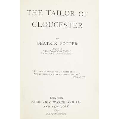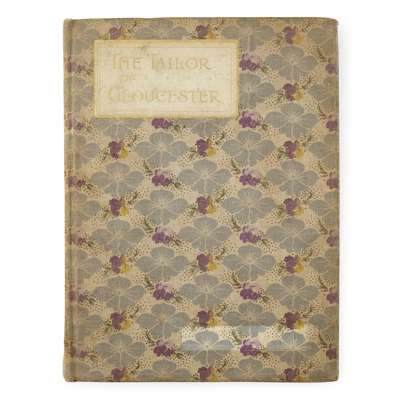 The Tailor of Gloucester. London: Frederick Warne and Co., 1903. First edition, first issue, deluxe issue in floral patterned fabric, 26 colour illustrations by Beatrix Potter, text-block detached, a few creases and some internal dust-soiling, faint gift inscription to dedication, covers dust-soiled with some discolouration to spine, author's name tag lacking from upper cover