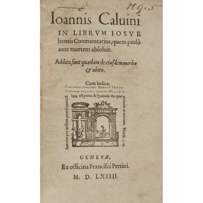 In librum Josue brevis Commentarius, quem paulò ante mortem absoluit. Addita sunt quædam de ejusdem morbo & obitu. Geneva: François Perrin, 1564. 8vo, [32], 316, printer's woodcut device on title-page, contemporary vellum, bookplate of Duncan Shaw and early inscription of Franciscus Saluardus, some slight worming in inner margin towards beginning (not affecting text), lacks 3 ties, vellum a little soiled, [USTC 450122; with link to Geneva Library copy only]