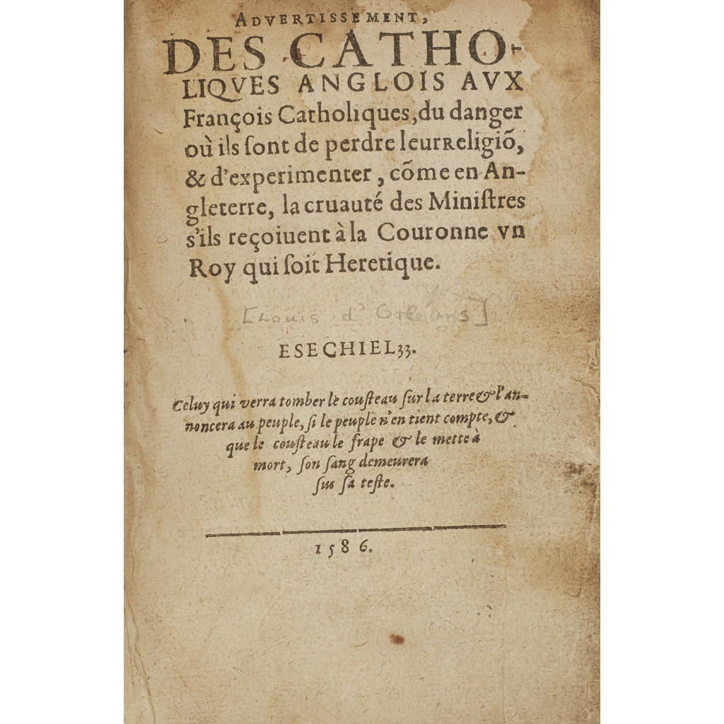 Advertissement des catholiques anglois aux françois catholiques du danger ou ils sont de perdre leur religion. [No place, no publisher], 1586. 8vo, 133, [3], last leaf blank, small corner of B2 torn away with loss of 1 letter, [USTC 89524 : 1 copy only (Paris) bound with Louis XII de France Apologie ou defence des catholiques unis les uns avec les autres. [No place, no publisher], MDXXCVI (1586), 8vo, 32pp., [USTC 4435]; bound with Louis XII de France Remonstrances aux catholiques de tous les estatz de France, pour entrer en l'association de la ligue. [No place, no publisher], 1586. 8vo, 23 [of 26] leaves, [USTC 77652], ?contemporary vellum, rather dampstained