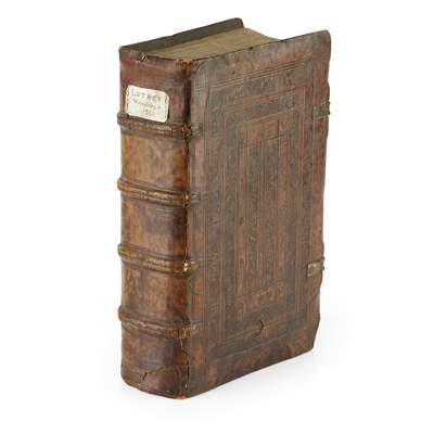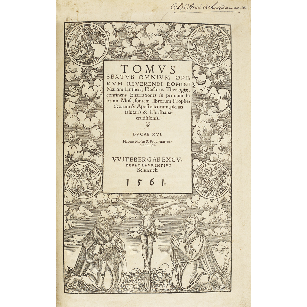 Tomus Sextus Omnium Operum. Witemberg: Lorenz Schwenck, 1561. Folio, [56], title within woodcut border, a little dampstaining to upper corner, loss of a few letters to sidenote p. 163, contemporary blind-stamped calf over wooden boards, roll-stamps containing portraits of Salvator, Filippus, Martinus, Johannes, joints a bit worn, repair to head and base of spine, lacks clasps, [USTC 698678, 11 copies recorded], name in ink D Arch Whitehouse at head of title