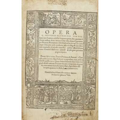 Opera. Q Septimii Florentis Tertulliani inter Latinos ecclesiase scriptores primi... è tenebris eruta atque à situ pro virili vindicata. Basel: Johann Froben, 1621. Folio (in sixes), [28], 615, [1], [68], title-page, dedication and a1 within woodcut border, woodcut initials and ornaments, 20th century red morocco lettered in gilt, small hole at foot of title just affecting woodcut & several words deleted with ink, some early marginal annotations, occasional soiling and staining, mostly to fore-margin, mostly light, [USTC 679658; 34 copies]