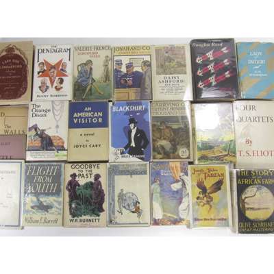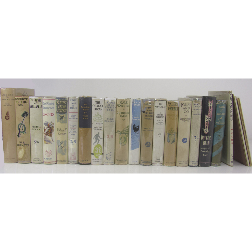 Lark Rise to Candleford. London: Oxford University Press, [1949?] 8vo, dust-jacket not price-clipped; Burnett, W.R. Goodbye to the Past. London: William Heinemann Ltd., 1935. 8vo, dust-jacket not price-clipped; Bevan, Elinith The Taste of Eve's Apple. London: Daniel O'Connor, 1922. First edition, 8vo, dust-jacket price-clipped; Wadsley, Olive Sand. London: Cassell and Company, 1927. Second impression, 8vo, dust-jacket not price-clipped; Barrett, William E. Flight from Youth. London: Peter Davies, 1940. First edition, dust-jacket not price-clipped; Burroughs, Edgar Rice Jungle Tales of Tarzan. London: Methuen & Co. Ltd., 1938. Twelfth edition, dust-jacket not price-clipped; Cary, Joyce An American Visitor. London: Ernest Benn Limited, 1933. First edition, first issue, 8vo, dust-jacket not price-clipped; Eliot, T.S. Four Quartets. London: Faber and Faber, 1944. 8vo, original cloth, gift inscription to free end paper, dust-jacket not price clipped, light chipping to jacket, light browning to free endpaper, some soiling; [Idem] Little Gidding. London: Faber and Faber, 1942. First edition, 8vo, original boards, some discolouration and rubbing to corners, ownership inscription to free endpaper; H.D. The Walls do not Fall. Oxford: Oxford University Press, 1944. First edition, 8vo, original boards, some discolouration and rubbing to corners, gift inscription to title page, very light browning; Bayliss, John, and others Indications. London: The Grey Walls press, 1943. First edition, 8vo, cardboard binding, some rubbing and staining to covers; and 11 others