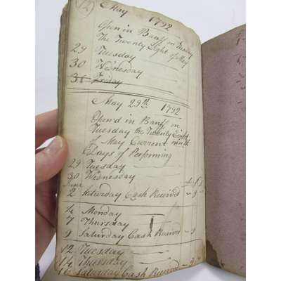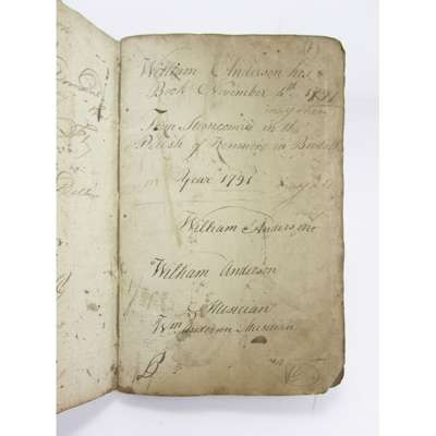 William Anderson, his book, November 4th 1791, from ? in the Parish of Kenmore in Breadalbane... Musician, 94 manuscript pp., many including details of where Anderson performed and how much he received for the performance, for example: "Arbroath / February 2nd 1792 / Joined the Company of Mr Johns and Mr Hamilton..., also containing notes and accounts from other family members, contemporary quarter calf over boards, 8vo