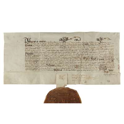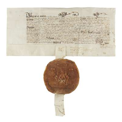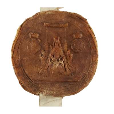 manuscript on vellum written in a secretarial hand with the seal attached, with the Queen's signature above
