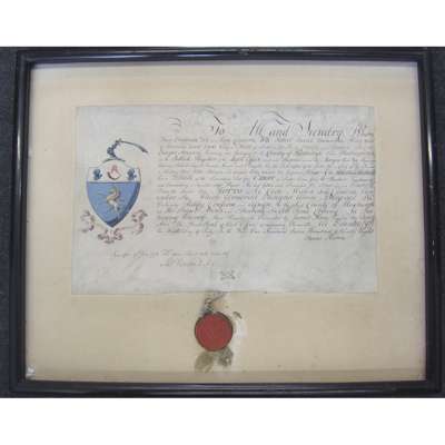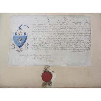 Earl of Kinnoul, King at Arms for Scotland, dated at Edinburgh 9th July, 1798. The grant is signed by James Home & Robert Ranken, Recorder, on vellum, with hand-coloured ensigns armorial in silver, gold, red, blue, purple and black, complete with red wax heraldic seal , suspended by white silk cord, and contained within the bottom half of its original tin skippet