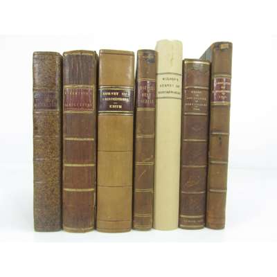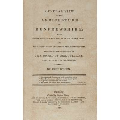 Edinburgh, 1795. 8vo, hand-coloured folding map & 11 plates, contemporary specked calf, neatly rebacked; Keith, G.S. A General View of the Agriculture of Aberdeenshire. Aberdeen, 1811. 8vo, hand-coloured folding map and 6 plates, contemporary half calf, neatly rebacked; Trotter, J. General View of the Agriculture of the County of West Lothian. Edinburgh, 1811. 8vo, folding map & 6 plates, several folding, contemporary half calf; Wilson, John General View of the Agriculture of Renfrewshire. Paisley, 1812. 8vo, hand-coloured folding map and 2 plates (1 folding), folding table, modern period style boards, uncut, slightly spotted; Kerr, Robert General View of the Agriculture of the County of Berwick. London, 1809. 8vo, folding map & 2 plates, contemporary half calf gilt; Whyte, Andrew General View of the Agriculture of the County of Dumbarton. Glasgow, 1811. 8vo, map and 3 plates, later half calf, t.e.g., slightly faded; Robertson, J. General View of the Agriculture of Perth. Perth, 1799. 8vo, engraved plates, contemporary calf, lacks map, rubbed (7)