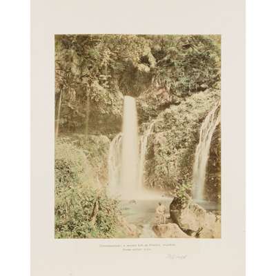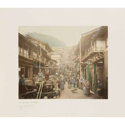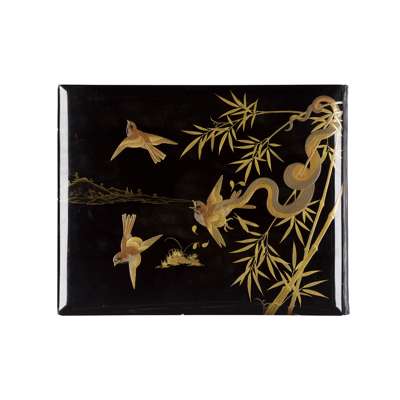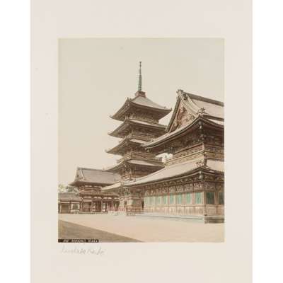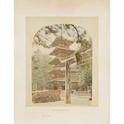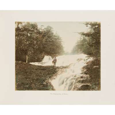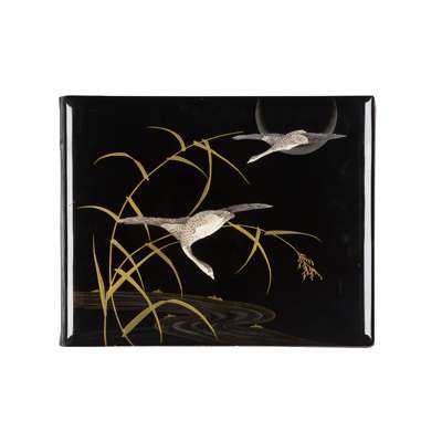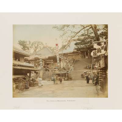 50 albumen prints, c.1890-1910, including The Grand Hotel Yokohama, Public Gardens Yokohama, The Grave of Tokugawa Shogun leyasu, Garden of Dainichido at Nikko, street scenes by Kimbei, Church-Yard of Kurcdani Kyoto, Nagasaki (possibly by Hikoma); and others, in a contemporary black lacquer album with painted ivory onlays in the design of two geese, and delicately painted decoration depicting a moon and pond, the reverse with a gilt painted sparrow, bamboo and snake design, with a renewed black calf spine, and original box (worn and split)