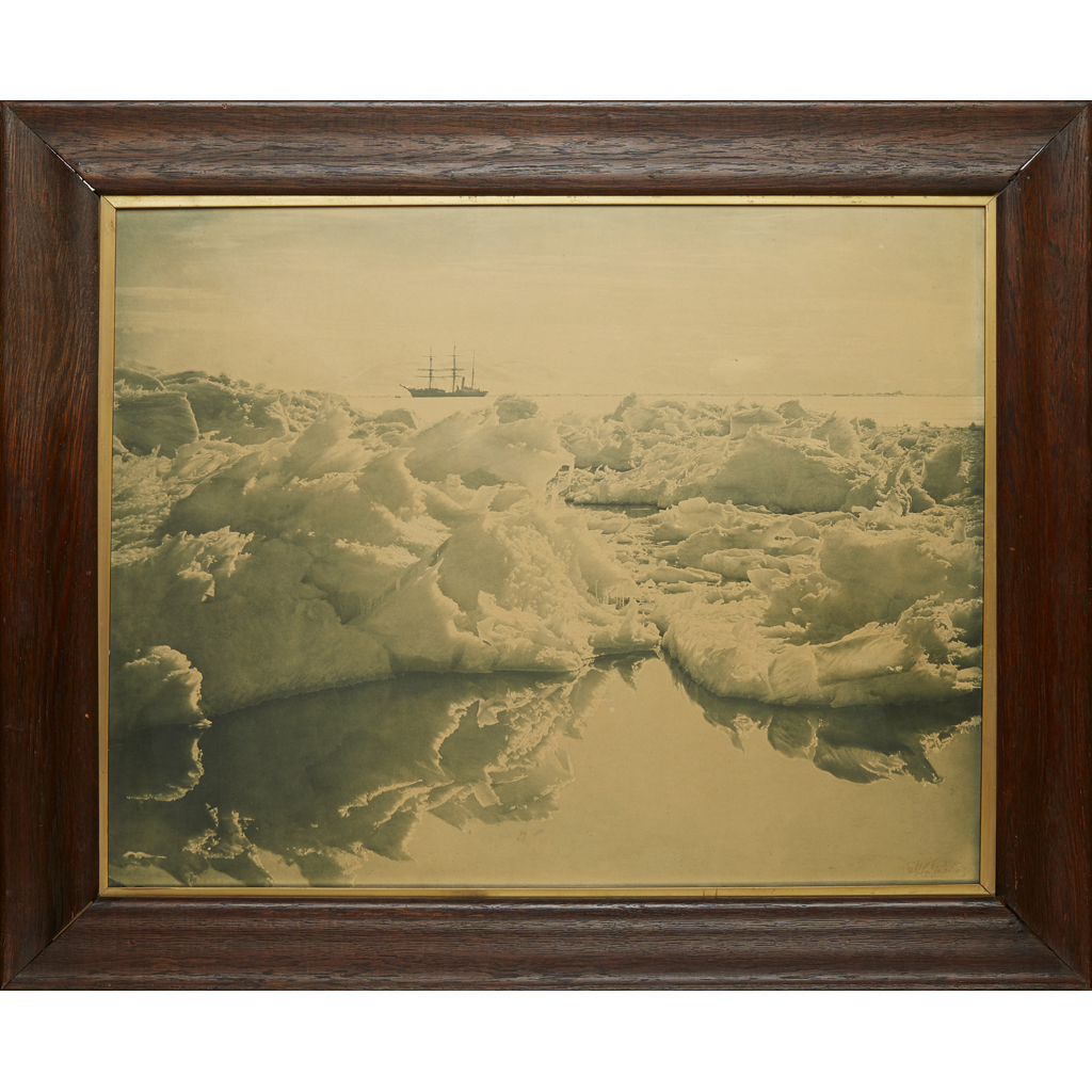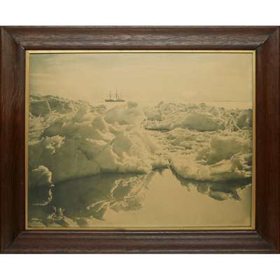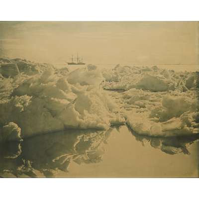 7 Jan. 1911, blue-green carbon print, with printed label on verso: "Notice. This photograph is enlarged from a negative made by Mr H.G. Ponting during the British Antarctic Expedition and is Copyright in all Countries. Sole Agents The Fine Art Society, 148 New Bond St., London", and with caption "The Terra Nova in McMurdo Sound" and "number 26" supplied in ink, H G Ponting signature blindstamp in lower right corner, slightly faded