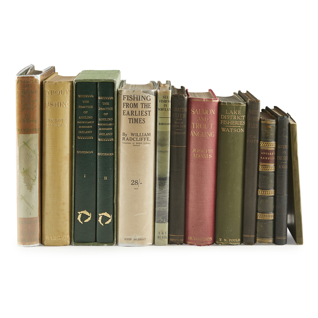 First edition, 12mo, 5 maps (2 with repairs), original green cloth gilt, occasional dust-soiling; Knox, A.E. Autumns on the Spey. 1872. 8vo, 4 plates, original pictorial cloth, rubbed; Ogden, James Ogden on Fly Tying. Cheltenham, 1879. First edition, 8vo, 2 mounted albumen prints, 4 lithographed plates, errata slip, original brown cloth gilt; Jackson, John The Practical Fly-Fisher. London & Leeds, 1880. Third edition, 10 hand-coloured engraved plates, original green cloth ,lightly rubbed; M[ascall] L.[onard] A Booke of Fishing with Hooke and Line.. reprinted from the edition of 1590. London, 1884. Limited to 200 copies, 8vo, original quarter brown morocco, bookplates of D.R. Clark and James Donald Dobson, rubbed; Pritt, T.E. North-Country Flies. 1886. Second edition, 12 lithographed plates, original cloth gilt; Halford, Frederic M. Floating Flies and how to Dress them. 1886. First edition, 8vo, 10 hand-coloured plates, olive cloth gilt; Jesse, E. An Angler's Rambles. 1836. First edition, 8vo, half green calf, rubbed; Harding, E.W. The Flyfisher & the Trout's Point of View. 1931. 4to, dustwrapper; and c. 30 others