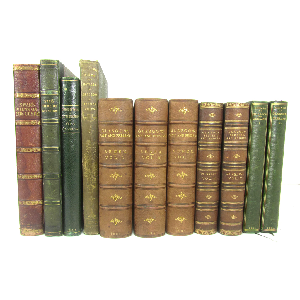 Select Views on the River Clyde. Glasgow, 1830. 4to, contemporary half morocco, slightly rubbed; [Idem] Select Views of Glasgow and its Environs. Glasgow, 1828. 4to, contemporary half morocco; Stewart, George Curiosities of Glasgow Citizenship. Glasgow: James Maclehose, 1881. 8vo, contemporary quarter morocco; Views and Notices of Glasgow in Former Times. Glasgow: Robert Stuart & Co., 1848. 4to, original green cloth gilt; 'Senex' Glasgow, Past and Present. Glasgow: David Robertson and Co., 1884. 3 volumes, 8vo, number 461 of 500 copies, contemporary half morocco, slightly rubbed; Gordon, J.F.S Glasghu Facies: a view of the City of Glasgow... Glasgow: John Tweed, [1872] 2 volumes (of 4), 8vo, contemporary half morocco; Cleland, James Annals of Glasgow... Glasgow, 1816. 2 volumes, 8vo, later green half morocco; Mackenzie, Peter Reminiscences of Glasgow and the West of Scotland. Glasgow: John Tweed, 1865. 2 volumes, 8vo, contemporary half calf; MacGregor, George The History of Glasgow. Glasgow: Thomas D. Morison, 1881. 8vo, contemporary half morocco; Pagan, James Sketches of the History of Glasgow. Glasgow: Robert Stuart & Co., 1847. 8vo, original cloth gilt; Burns, Robert The Works. London: William Paterson & Co., 1891. 6 volumes, 8vo, contemporary half calf gilt with red morocco labels to spines; and 20 others, sold not subject to return (41)