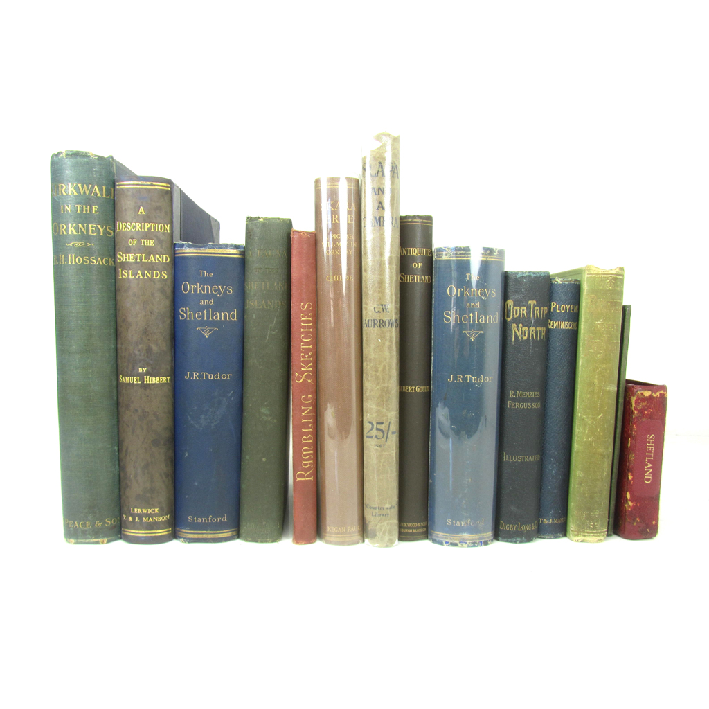 4to, original boards, dustwrapper, boards and dustwrapper slightly worn at head and base of spine; Standen, Edward A Paper on the Shetland Islands. Oxford, 1845. First edition, 12mo, original cloth gilt; Tudor, John R. The Orkneys and Shetland. 1883. 8vo, plates, maps, original blue cloth, neatly repaired at head and base of spine, binding lightly marked; Tudor, John R. Another copy, ex-library, with stamps; [Photograph Album] Album with 10 mounted albumen prints of Shetland, 8 by J. Valentine and captioned in photograph, images 9 x 14cm., contemporary red morocco, rebacked, rubbed; Fergusson, R.M. Rambling Sketches in the Far North and Orcadian Musings. 1883. 8vo, original cloth; Fergusson, R.M. Rambles in the Far North. 1884. Second edition, 8vo, original pictorial cloth gilt, slightly rubbed; Fergusson, R.M. Our Trip North. 1892. 8vo, original cloth; Ployen, Christian Reminiscences of a Voyage to Shetland, Orkney & Scotland in the summer of 1839. Lerwick, 1896. Second edition, frontispiece, original cloth, slightly rubbed; Evans, A.H. & T.E. Buckley A Vertebrate Fauna of the Shetland Islands. 1899. 8vo, plates, original cloth slightly rubbed at head and base of spine; Hossack. B.H. Kirkwall in the Orkneys. Kirkwall, 1900. 4to, original cloth, binding slightly rubbed & slightly soiled; Goudie, Gilbert The Celtic and Scandinavian Antiquities of Shetland. 1904. 8vo, original cloth, library stamps; Hibbert, Samuel A Description of the Shetland Islands. Lerwick, 1931. 4to, blue half calf gilt; Childe, V.G. Skara Brae. 1931. 4to, plates, original buckram slightly marked; and 15 later volumes (c.27)