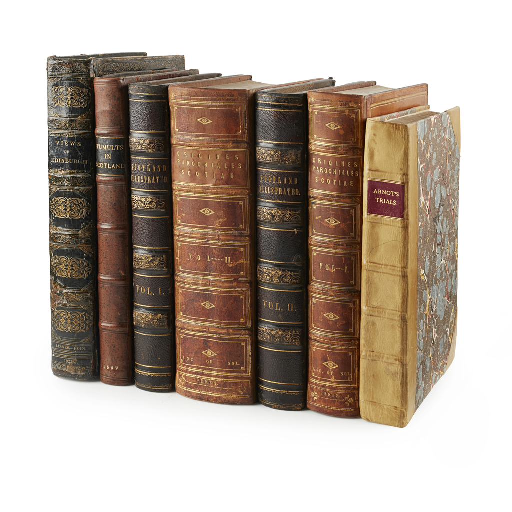 4to, vignette title, 51 engraved plates, black calf gilt, slightly spotted, repaired and rubbed; Beattie, William Scotland Illustrated in a Series of Views. 1848. 2 volumes, 4to, 118 engraved plates, folding map, contemporary maroon half morocco, some spotting, slight staining to engraved titles, rubbed; [Innes, C.] Origines Parochiales Scotiae. 1851-54. 2 volumes, 4to, Solicitors stamp to titles, folding map, contemporary calf gilt, g.e., neatly rebacked retaining spines; [Balcanquhall, Walter] A Large Declaration concerning the late Tumults in Scotland. London, 1639, folio, contemporary calf, lacks portrait, neatly rebacked, [ESTC S116832]; Arnot, H. A Collection and Abridgement of Celebrated Criminal Trials in Scotland. Edinburgh, 1785. 4to, modern half calf, title slightly dust-soiled and creased (7)