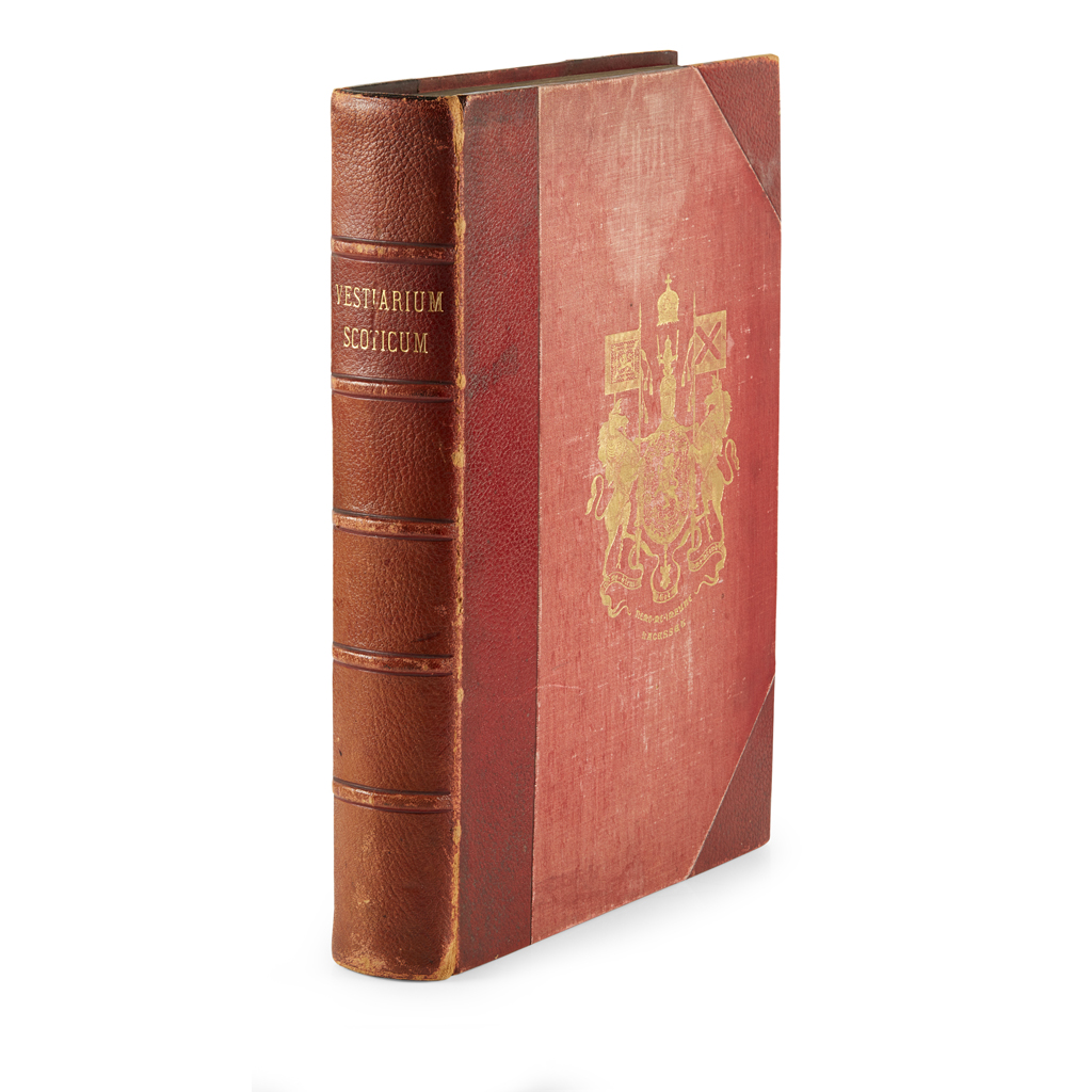 From the Manuscript formerly in the Library of the Scots College at Douay. Edinburgh: W. Tait, 1842. Folio, one hand-coloured plate and 75 mounted coloured plates of tartans, half red morocco gilt, some spotting to endpapers and fore-edges not affecting plates, binding slightly rubbed and slightly marked