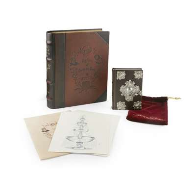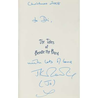 London: Children's High Level Group, 2008. First edition, 8vo, with Hologram sticker to front marbled free endpaper, presentation copy inscribed "Christmas 2008. To Di, with lots of love, J.K. Rowling (Jo) x" on half-title, original brown calf binding embellished with metal skull, corner pieces and clasp incorporating replica blue gemstones, maroon morocco bag, with envelope of Collector's Edition Prints containing 10 prints, housed in a velvet-lined brown calf box lettered and decorated on upper cover, with the publisher’s lightly rubbed and creased white card sleeve printed in black to the upper panel "This Side Up".
