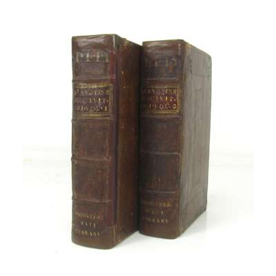 [Geneva], Jacob Stoer, 1596. 2 volumes, 8vo, pp. 32, [24], 759, [1], 51, [1]; [24], 742, [42], titles within woodcut border, 18th century panelled calf, pp. 177-192 of volume 2 misbound, pp.2, 293 & 613 of vol. 1 misnumbered, head- and tail-bands renewed, vol. 1 joints repaired, gilt stamp "Magdalene Hall Library" to foot of spines, [USTC 451522]