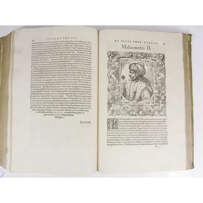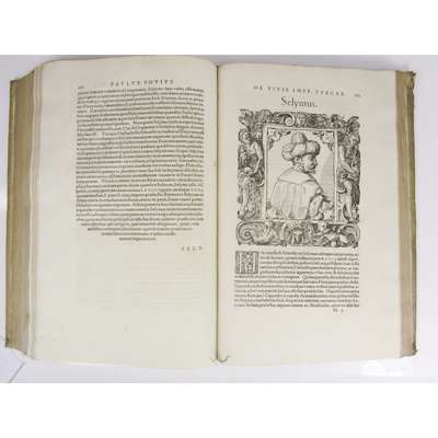 comprehensae & propriis imaginibus illustratae. Basel: Petri Pernae, 1678-1677. Folio, two volumes in one, [12], 427; [8], 225; title within ornate pictorial woodcut border, numerous fine woodcut portraits, [this edition not in USTC]; [bound with:] Regionum et Insularum atque Locorum Descriptiones, videlicet Britanniae, Scotiae, Hyberniae, Orchadum. Basel, 1578. Folio, 156, [7], later vellum-backed boards, red morocco lettering piece, a few light spots, variable worming to some margins, boards a bit soiled and rubbed