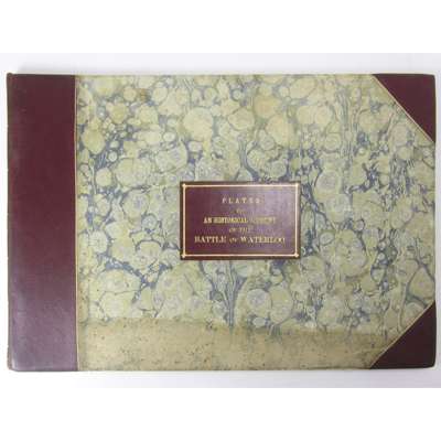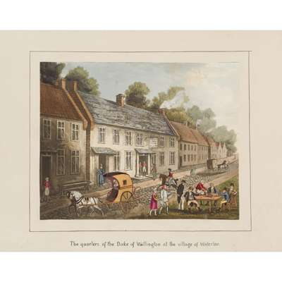 [London, 1817]. Oblong folio, hand-coloured engraved title ("An Historical Account of the Battle of Waterloo") by G. Cruikshank, and 23 (of 27) hand-coloured aquatint plates, all cut round, mounted and captioned in pen beneath, also lacks the text and 2 maps, modern red half morocco retaining early marbled boards, new morocco lettering piece to upper cover
