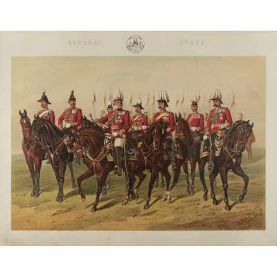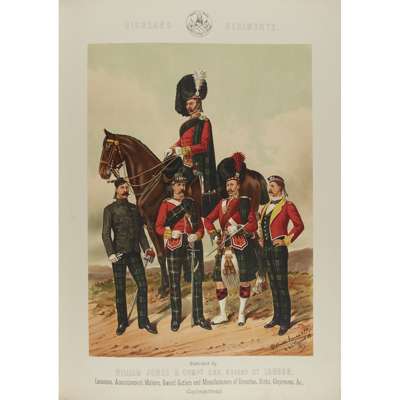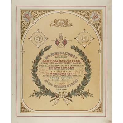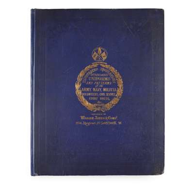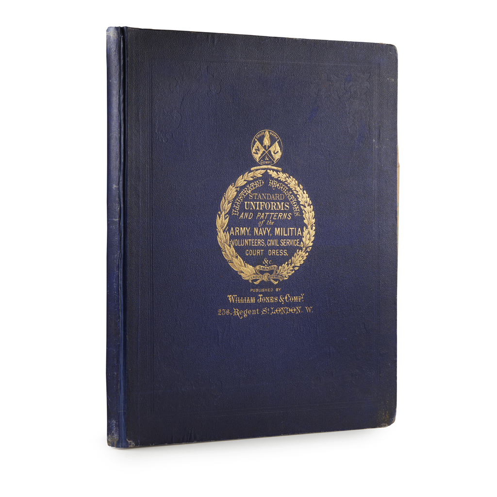 London: Jones & Co., [c.1886], large folio, chromolithographed advertisement leaf, 27 chromolithographed plates, 4 tinted lithographed plates and 15 lithographed outline plates by A.B. Court, with details, accoutrements and outline patterns for uniforms, one uncoloured plate repaired in margin, publisher's blue cloth gilt, [Colas 3076], neatly rebacked retaining original spine