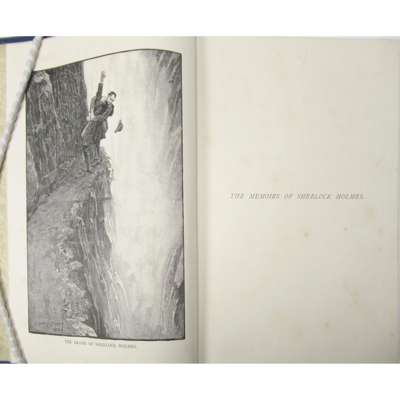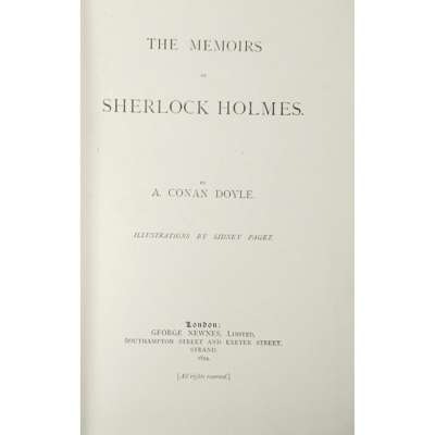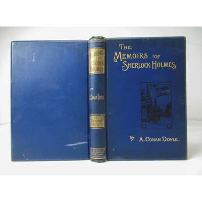 London: G. Newnes. 1894. First edition in book form, illustrations by Sidney Paget, original dark blue pictorial cloth gilt, covers slightly marked and stained, scratch to lower cover, binding slightly skewed, extremities slightly rubbed, presentation inscription from Aldenham Institute Shorthand Society to Mr F.W. Harris, April 1894, to verso of front free endpaper