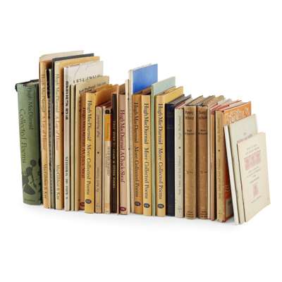 Sangschaw. 1925. First edition, 8vo, dustwrapper slightly discoloured; Penny Wheep. 1926. First edition, 8vo, dustwrapper slightly discoloured; First Hymn to Lenin. Unicorn Press, 1931, number 71 of 450 copies, original black and red cloth, t.e.g., slipcase; Three Hymns to Lenin. [n.d.], signed by the author on endpaper, dustwrapper; The Ministry of Water. 1964. number 72 of 125 copies signed by the author, original wrappers; Annand, J.K. Early Lyrics by Hugh MacDiarmid. Akros, 1968, number 22 of 50 numbered copies, signed by Annand and MacDiarmid, original wrappers; another copy. inscribed to Barbara and Earn [Niven], original wrappers; Collected Poems. New York, 1962, presentation copy to Sydney Goodsir Smith, original cloth, dustwrapper slightly frayed; O Wha's been here before me, lass. Blue Moon Poem for Christmas 1931. number 20 of 100 signed copies, folded card; A Lap of Honour. 1967. First edition, presentation copy to Barbara and Earn [Niven] from the author, dustwrapper rubbed and slightly marked; A Clyack-Sheaf. 1969, signed by the author, original cloth, dustwrapper; another copy. Presentation copy to Barbara and Earn [Niven] from the author, original cloth, dustwrapper; Poems of the East-West Synthesis. [Undated], presentation copy to Edward Nairn and Ian Watson, original wrappers; and 26 others (36)