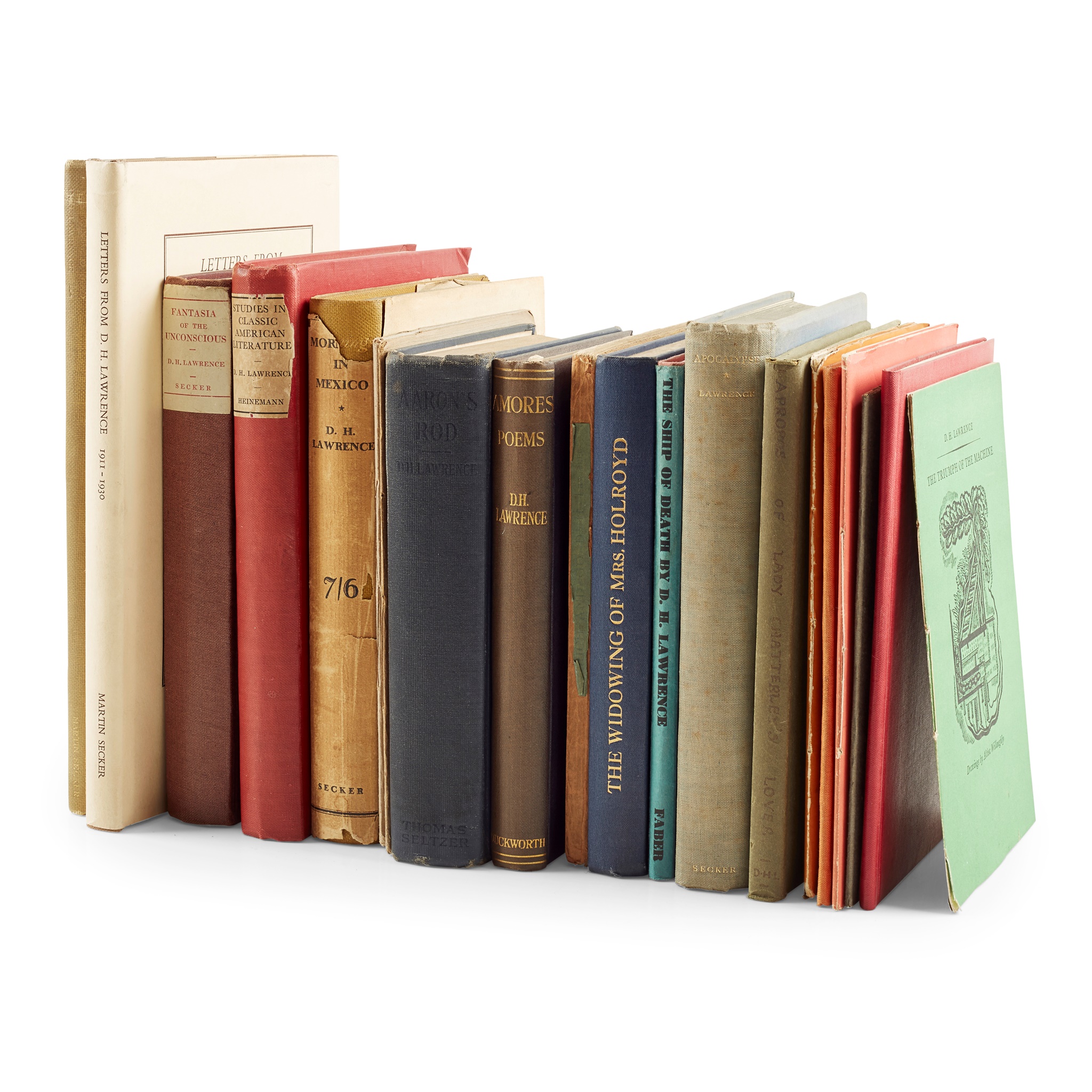 First British edition, early inscription on endpaper, original cloth; Amores. Poems. London: Duckworth & Co., [1916], original blue cloth; Touch and Go. 1920, original salmon coloured boards, dust-soiled and slightly rubbed; Aaron's Rod. New York, 1922, original cloth, some pages marked, slightly rubbed and slightly soiled; Fantasia of the Unconscious. 1923, original cloth, slightly marked; Mornings in Mexico. London: M. Secker, 1927. original cloth, frayed dustwrapper; A Propos of Lady Chatterley's Lover. 1930, original cloth, dustwrapper, near mint copy; The Man who Died. 1931, 4to, original green buckram, fading; Apocalypse. 1932, original cloth, faded and slightly marked; The Ship of Death. 1941, dustwrapper; The Triumph of the Machine. [n.d.], Ariel Poem no. 28, original green wrappers; Pornography and Obscenity, 1929; Nettles, 1930, 2 copies original wrappers and 2 copies, orange and red cloth; Studies in Classic American Literature. Heinemann, [n.d.], original cloth; Merrild, K. A poet and two painters, 1938, original cloth; Letters from D.H. Lawrence to Martin Secker 1911-1930 MS, Privately Published, 1970. Number 166 of 500 copies, original buckram, dustwrapper; Leavis, F.R. D.H. Lawrence. Cambridge, 1930, original wrappers; Murry, J.M. D.H. Lawrence. Cambridge, 1930, original wrappers; and c. 25 others by, with contributions by, or relating to Lawrence (44)