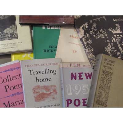 inscribed to R.B.K. Stevenson, dustwrapper; Graham, W.S. The Seven Journeys. 1944, original quarter cloth, dustwrapper lightly frayed; Scott, C. The Celestial Aftermath. 1915., original cloth; Newbolt, Henry. Poems, new and old. 1912, number 58 of 100 copies, signed, original vellum; Scott, G. A Box of Paints. WIth drawings by Albert Rutherston. 1923, original quarter cloth, inscribed by the artist; Boulton, Sir H. The Huntress Hag of the Blackwater. 1926. dustwrapper; Masefield, John. End and Beginning. 1933, number 120 of 175 copies signed, original buckram, slipcase; Rickword, E.The Solitary Way. 1934, dustwrapper; Soutar, William. Riddles in Scots. 1937, inscribed to the Balmacronians, dustwrapper; Soutar, William. Collected Poems. 1947, number 4 of 50 signed copies, dustwrapper; Cornford, F. Travelling Poem. 1948, dustwrapper; Hay, G.C. Wind on Loch Fyne. 1948, inscribed by the author, dustwrapper; Reeves, James. The Imprisoned Sea. 1957, inscribed by the author, dustwrapper; Shire, H.M. Poems from Panmure House. Cambridge: S. Carter, 1960, number 28 of 100 copies, original wrappers; Gunn, Thom. The Garden of the Gods. Pym-Randall Press, 1968, number 144 of 226 copies, signed, original wrappers; Chamberlain, B. Poems with Drawings. Enitharmon Press, 1969, number 183 of 200 copies signed by the author, dustwrapper; Sisson, C.H. Night Thoughts. Inky Parrot Press, 1983, number 317 of 326 copies, signed, original wrappers; Robertson, Love Poet, Carpenter. Michael Longley at Sventy. Enitharmon Press, 2009, signed by all the contributors, original cloth, slipcase; Longley, Michael. A jovial hullabaloo. Enitharmon Press,number 50 of 75 copies, one of 50 numbered 1050, signed, original cloth, slipcase; Nairn, Edward G. Distances, poems. Aurora Borealis, 2010, one of 120 copies, original wrappers; Thomas, E. Rupert Brooke. Beauly, Privately Printed, 2012, number 37 of 45 copies, original wrappers; and many others