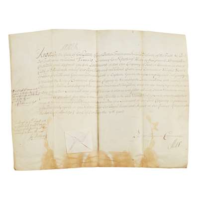 on vellum, appointing Francis Lindsay as Lieutenant in the Company of Foot in Garrison in the Castle of Edinburgh under the governorship of David Earl of Levan, Countersigned by the 6th Earl of Mar, dampstained at foot, folds, paper seal, Kensington, 6 March 1707/08