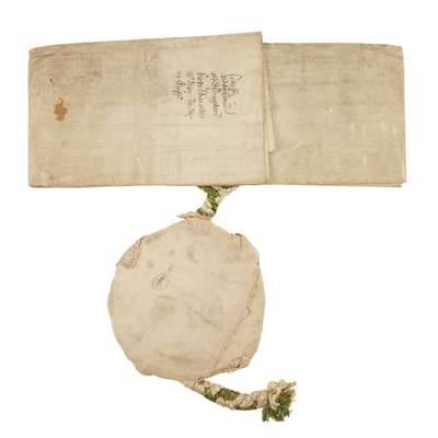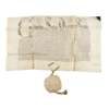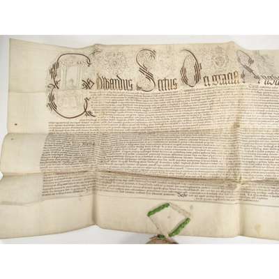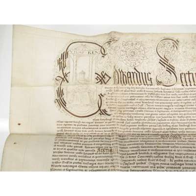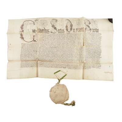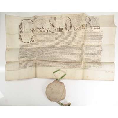 later First Baron Howard of Effingham, of the Manors of Little Bookham (Surrey), Kettleburgh, Polstead (Suffolk) and elsewhere, manuscript on vellum, in Latin, written in a fine chancery hand, fine large ink initial E with portrait of Edward VI enthroned, upper line decorated with other initials and upper margin decorated with royal arms, heraldic devices and a Tudor rose, ruled in red, a few holes at folds slightly affecting text, some wear and obscuring of text along folds, slightly soiled at edges, great seal appended (broken and preserved in a linen bag), 435 x 712mm, 29th March 1555