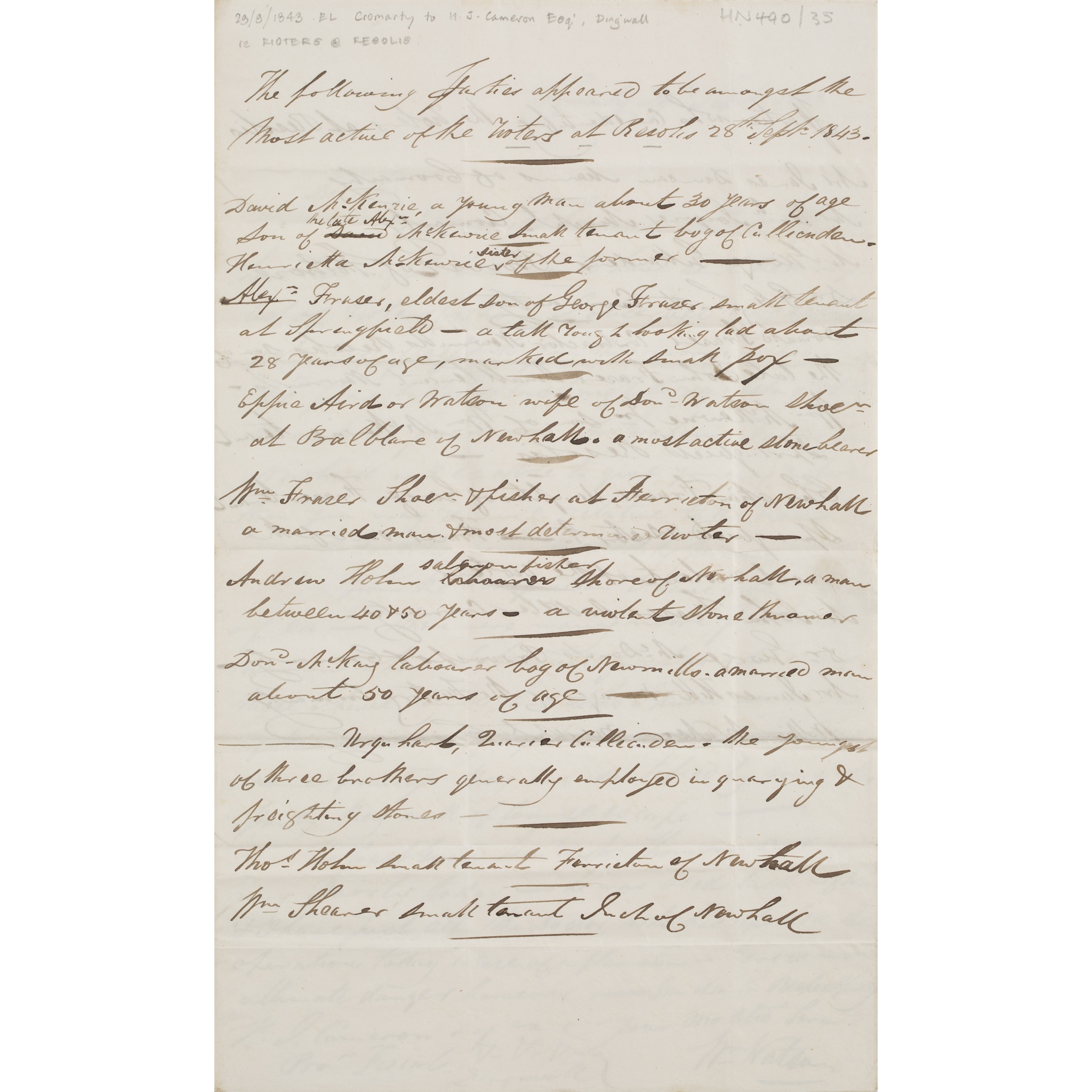 at Dingwall, dated Cromarty, 29th September 1843, in which he names a large number of people who are accused of being 'the most active of the rioters at Resolis' the previous day, as well as a long list of parties 'who can identify the rioters at Resolis', sent to H.J. Cameron at Dingwall, one small seal tear affecting one word, otherwise fine condition, 3pp., folio, (purchased Muddock Madeley, July 2003, lot 238)