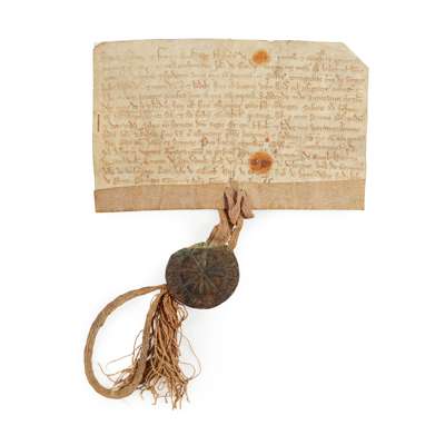 of 76 acres of land in Polre [Poldre or Poldhurst, in Harbledown, Kent], n.d., probably early 13th century, next to the land of Froggehole at an annual rent of 8 shillings, and for this the said John has given 20 marks. With the witnesses names of : Bertram do Crioyl, Henry de Sandwich, Simon de Sandwich, Robert de Rokelle, Robert do Valoignes, Robert de Cerinton, John de Valoignes, Ranulph de Gosehal, Henry de Ospring, Robert de Bermundesaye, Ralph de Pirie, Philip Torri, & John Torri, small parchment title deed in Latin, ink a little faded but writing clear, with a fine personal seal with the clear legend, "Sigill Nicolai De S", round with a star in the centre, of green wax on silk laces, slight damage to the edge affecting part of the name, accompanied by a modern description