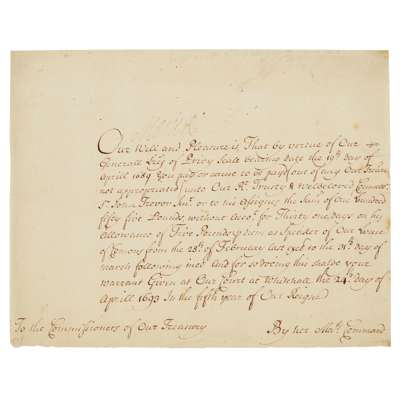 Written in a secretarial hand, ordering the Commissioner of the Treasury to pay the Speaker of the House, Sir John Trevor, £155 for 31 days, signed 'Marie R.' above the text, dated 24th April 1693, 17.5 x 22cm