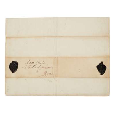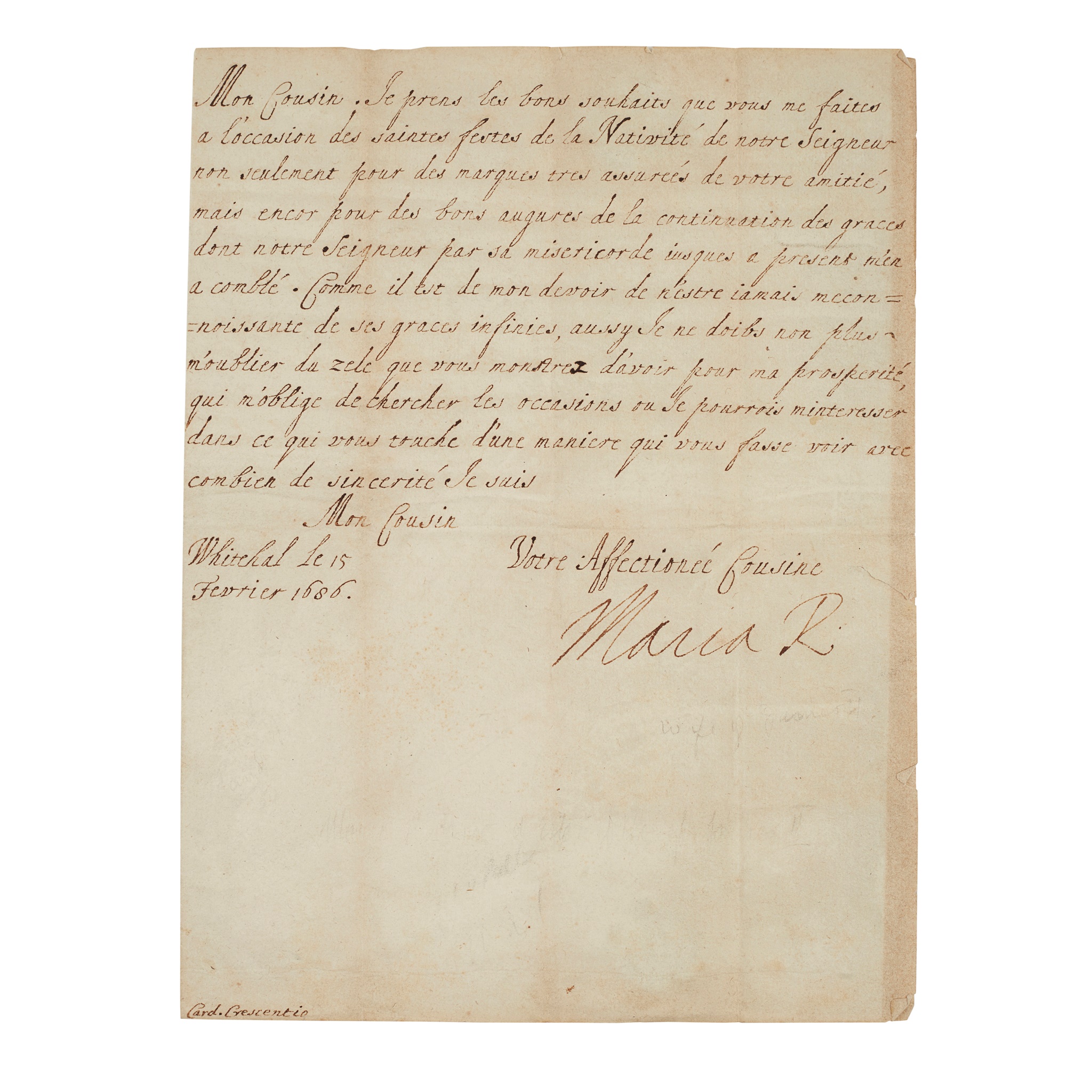 one page, 4to (22 x 16.5cm), to Cardinal Crescentio in Rome ('Mon Cousin'), in French. The Queen writes a diplomatic letter thanking the Cardinal for his greetings on the holy feast of the Nativity and also refers to God's infinite graces and to the Cardinal's zeal for her prosperity, with integral address leaf bearing two black wax armorial seals, a couple of minor tears to edges, not affecting the text or signature, Whitehall, 15th February 1686