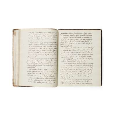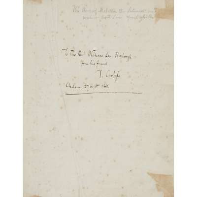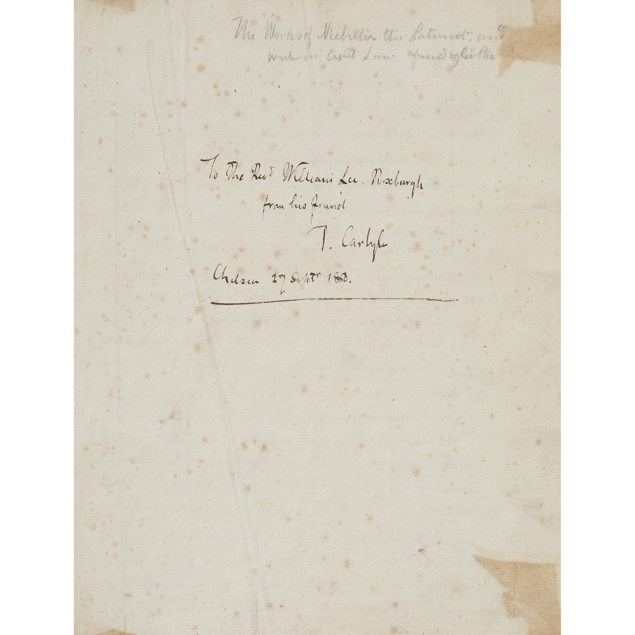 manuscript volume inscribed to free-endpaper: "To the Revd William Lee, Roseburgh, from his friend T. Carlyle Chelsea 27 Septr. 1860", containing "The Works of Niebuhr the Latinist...", 466 manuscript pages in German in an unknown hand, with the final leaf reading "Schluss um 29 Mai 1828", contemporary 19th century half calf gilt, joints split