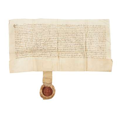 of a Carucate of Land near Petkox [Stenton, Haddingtonshire] on the North of the water of Bele within the lands of Clyntis, Joniscluche, Westmvre, and also the 40 merk land in Mersington, no date or place but c. 1430, a vellum document with a fine impression in red wax (set in white wax) of the Earl's circular seal, showing a lion rampant within a shield of eight roses, above is a crested helmet and a bridled horse head, and the supporters are two crouching lions with a tree beside each, with the legend 'Sigillum georgii de dunbar comitis marchie', 22 x 43cms.