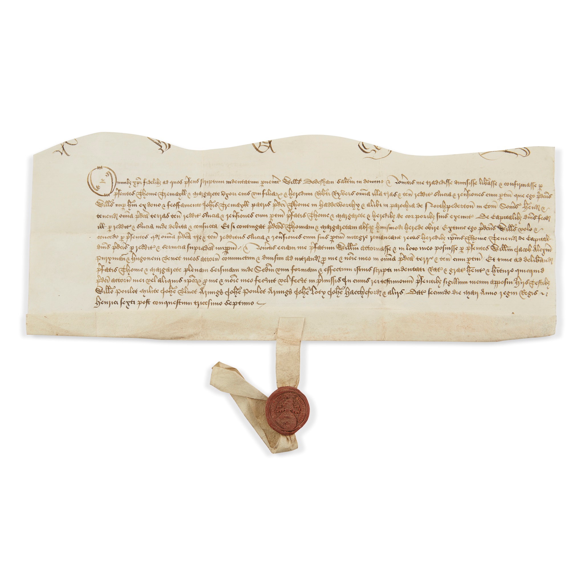 and Robert ?Lykers Heir, confirming a grant of land in fee in the parish of North Pederton [North Petherton], manuscript on vellum, in Latin, 12 lines, folds, wax armorial seal, 120 x 340mm., in good condition, 2nd May 1459