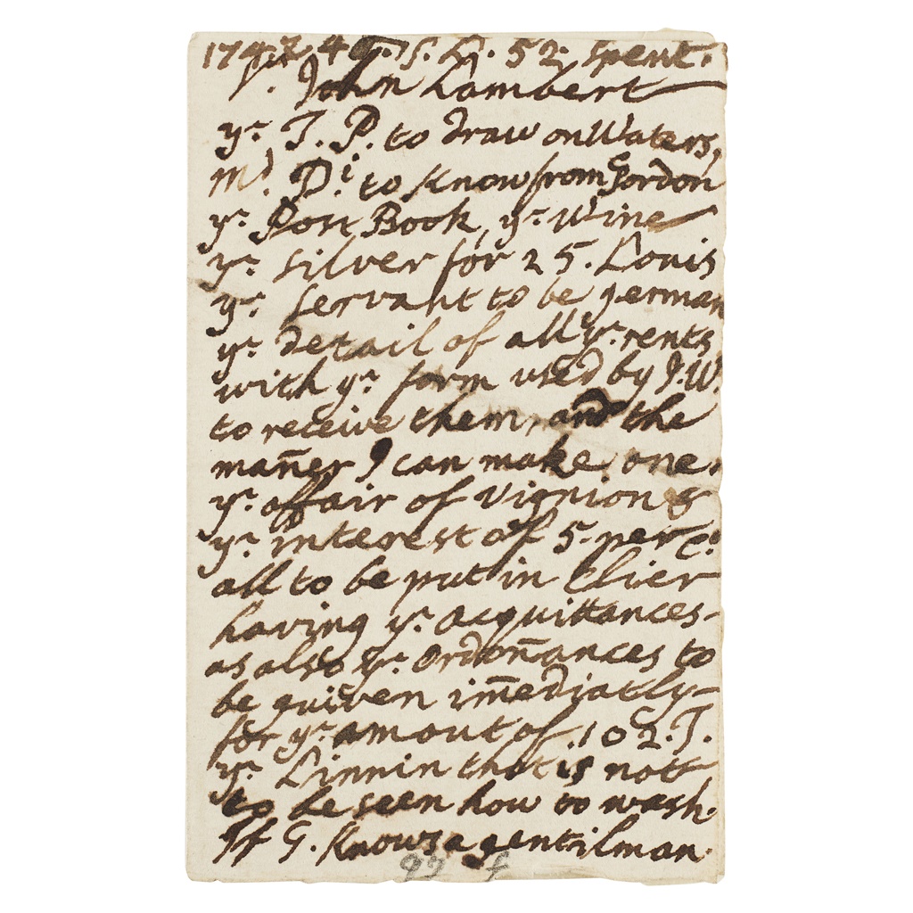 concerning his financial affairs, in the form of a list headed "1747" and then several indistinct figures ending "S.L. 52 Spent. S[i]r John Lambert"
