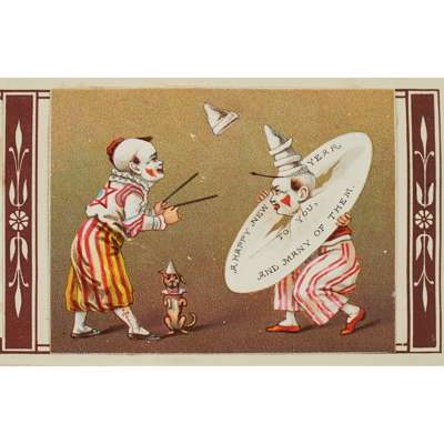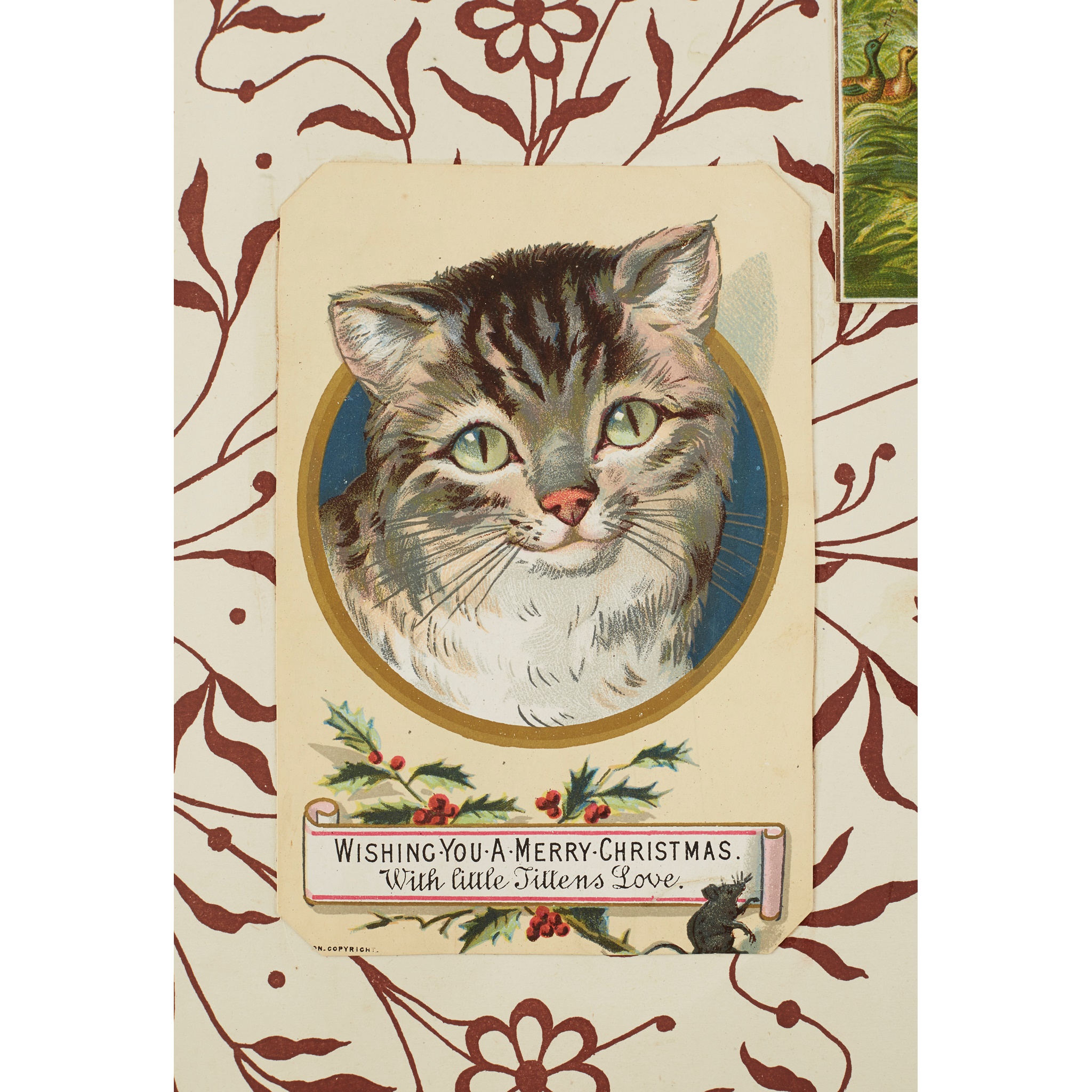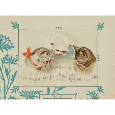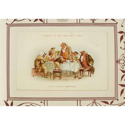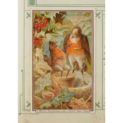 Christmas card album containing 26 Christmas and New Year cards, including one with an anthropomorphic goose and plum pudding, 2 Chinese paintings on leaf skeletons and several other cards; Greetings card album with 114 cards, many Christmas cards; Christmas card album containing 15 cards; Scrapbook containing 143 Christmas cards; Christmas card album with 148 Christmas cards including anthropomorphic robins taking a foot bath and a dining table surrounded by anthropomorphic robins toasting the New Year; Christmas card album with 89 Christmas and New Year cards; Greetings card album with 103 cards, including a Christmas card showing hares at the barbers and cats on a roof playing musical instruments; Christmas and Valentine's Day card album with 12 Valentine's cards and a selection of Christmas, New Year and Birthday cards (8)