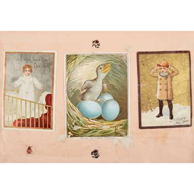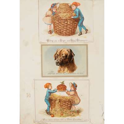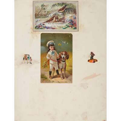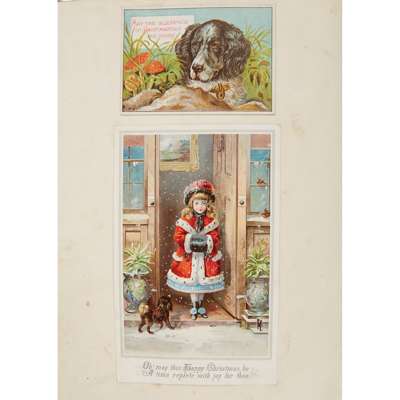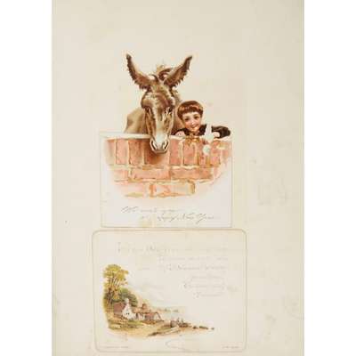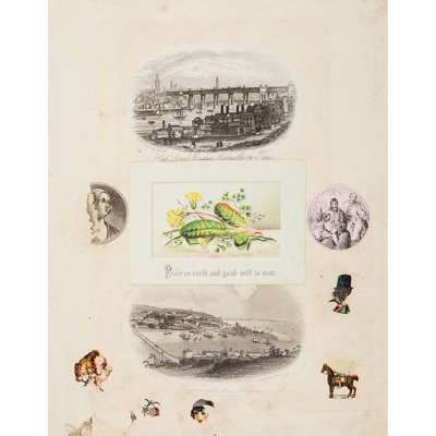 comprising wood, copper and steel engravings and lithographs of British & European landscapes, towns & portraits, some hand-coloured, a few watercolours of birds and plants and Scottish views, manuscript poetry, original pencil drawings, cut out coloured engravings and scraps, Anna May Wong signed card, some 20th century Christmas cards, hand-coloured costume prints, morocco and half morocco bindings, worn, one belonging to Charles Russell Colt, 3rd King's Own Light Dragoons, 1845 (13)