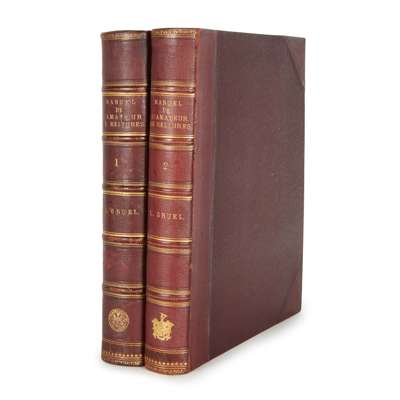 Manuel historique et bibliographique de l'amateur de reliures. Paris: Gruel & Engelmann, 1887-1905. 2 volumes, 4to, limited to 1000 copies, 1st part being copy number 780 of 700 copies on Vélin de Rives, volume 2 being number 148 of 600 copies on Vélin de Rives, heliogravure plates, library stamp of Newcastle upon Tyne Public Library to title and plate margins, and stamp to spines, maroon half morocco, joints rubbed, one splitting; Libonis, L. Les Styles enseignées par l'exemple. Paris: H. Laurens, [1894], 4to, plates, modern red morocco incorporating tan, mottled and brown morocco onlays; Viollet-le-Duc, E.E. Dictionnaire raisonné du Mobilier Français. Paris: Morel, 1872-75. 6 volumes, 8vo, chromolithographed plates, illustrations, contemporary red quarter morocco, a little light spotting; Yriarte, Charles. La Vie d'un Patricien de Venise au XVIe siècle d'après d'éstat des Frari. Paris: J. Rothschild, [1884]. Large 8vo, plates, illustrations, modern red morocco incorporating tan, mottled and brown morocco onlays (10)