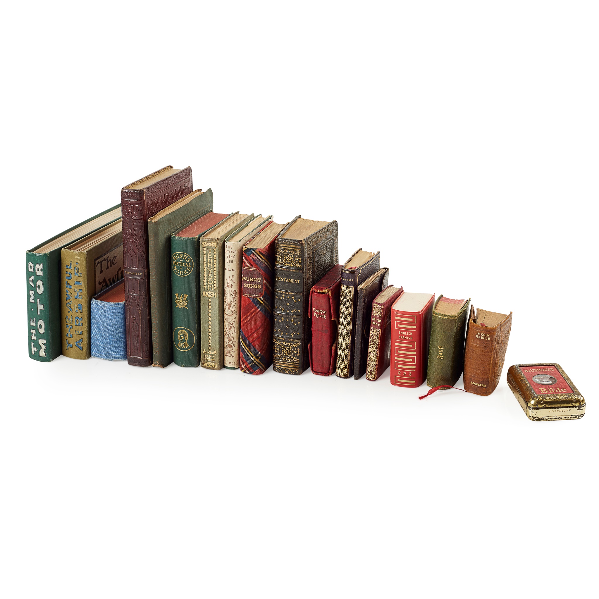 The Holy Bible. Glasgow: David Bryce and Son, [n.d.] 4.5 x 3cm, original embossed morocco, magnifier in rear pocket; The Holy Bible. Glasgow: David Bryce and Son, [n.d.] 4.5 x 3cm, original red morocco gilt, contained in metallic presentation case with magnifier; Goethe Faust. Leipzig: Schmidt & Günther, 1907. 5 x 3.5cm, contemporary green morocco gilt; Tilt's Miniature Almanack for 1860. London: W. Kent and Co., [1859]. 6.5 x 4cm, burgundy morocco, without pocket magnifier; Jackson, J. The Psalms of David in Metre. Glasgow: W.R. McPhun., [n.d.] 7.5 x 4cm, contemporary morocco gilt; New Testament of our Lord and Saviour Jesus Christ. London: George Eyre and Andrew Strahan, 1814. 24mo, contemporary gilt tooled straight-grained morocco; and 12 others (18)