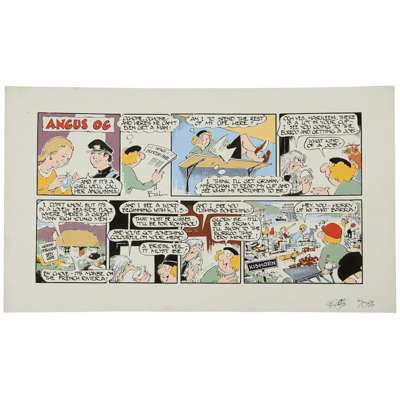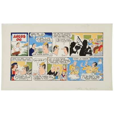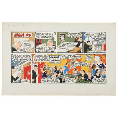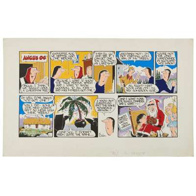 "Burns Supper", 46 x 29cm, in which the Drambeg Women's Guild toast Robert Burns with orange juice; "Council Lotteries", 46 x 29.5cm, in which the minister, Mr Macsonachan, discovers the 'Casino de Council'; "Christmas Tree", 28.5 x 46cm, in which Angus attempts to find a Christmas tree for his mother; "Fortune Telling", in which Mairileen asks Granny McBrochan to read the future, 36 x 27.5cm; each gouache on board, signed 'Bain' (4)
