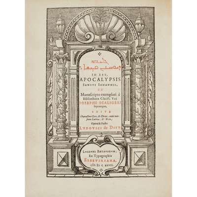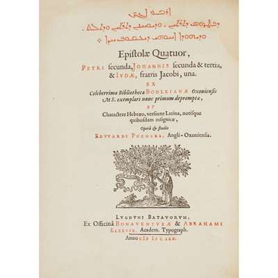 Leiden: Ex Typographia Elzeviriana, 1627. 4to [20], 211, [1] p. , title printed in red and black within woodcut border, text printed in Syriac, Syriac in Hebrew characters, Latin and Greek, printer's device on the verso of the final leaf [bound with] Epistolae quatuor, Petri secunda, Johannis secunda & tertia & Iudae, fratris Jacobi, una. Leiden: Bonaventur & Abraham Elzevir, 1630, 4to, [x], 66, title printed in red and black, 2 works in one volume, contemporary vellum, slightly dampstained