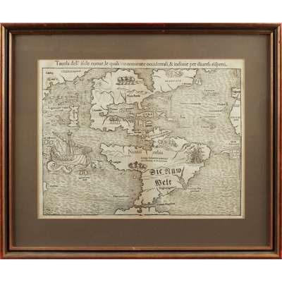 Note: Taken from the Italian edition of Münster's Cosmographia Universalis, this map (first published in Ptolemy's Geographia several years earlier) has the destinction of being the first map to show North and South America as continents, and the first European map to show Japan (labelled Zipangri). The map also features an infamous cartographic error, Verrazzano's Sea: a huge sea separating East and West Canada, reported by the explorer Giovanni de Verrazzano in 1524, from whose description Münster created the map.